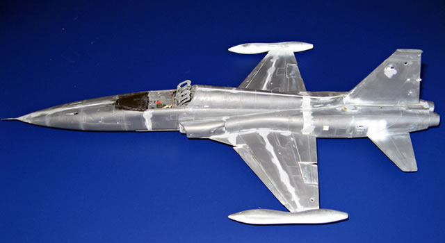 The kit claimed to be 1/48 scale, but when the F-5E pit was placed in, it was too large to fit inside. I suspected the Fujimi kit was undersize. After obtaining information and dimensions for the F-5A on the web, I discovered that the kit scale was close to 1/52 scale. Oddly, the fuselage height was close to 1/50 scale. To enlarge the model into a 1/48 scale would be next to impossible due to the complex shape of the fuselage. Also, there was no way to add height to the fuselage. Instead, I decide to make it into a 1/50 scale by adding 14mm to the overall length. The extensions were added forward of the cockpit and fuselage aft. The cockpit was sanded down to fit in the opening. Not an easy task, but I was able to make it work. The wings were also extended 4mm on each side, and widened 1.5mm to match the 1/50 scale length. The model now stood 288mm in length, and 154mm wing span. Another big tasks were drilling out holes and vents at various locations; there were 27 of them. Panel lines and access panels were scribed with the UMM razor saw at appropriate places.