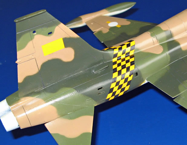 The checker band, insignias and fin flags yellow background were painted first. After finished, they were masked and the rest of the fuselage was painted. I mixed the medium green FS34102 with 50% Testor olive green little bottle. The tan FS30219 was lightened with a mixture of insignia white and yellow. The dark green FS34079 was darkened with 5 eye-drops of flat black into the bottle. The underside called for FS36622; I added about 50% white because it seemed a little too dark.